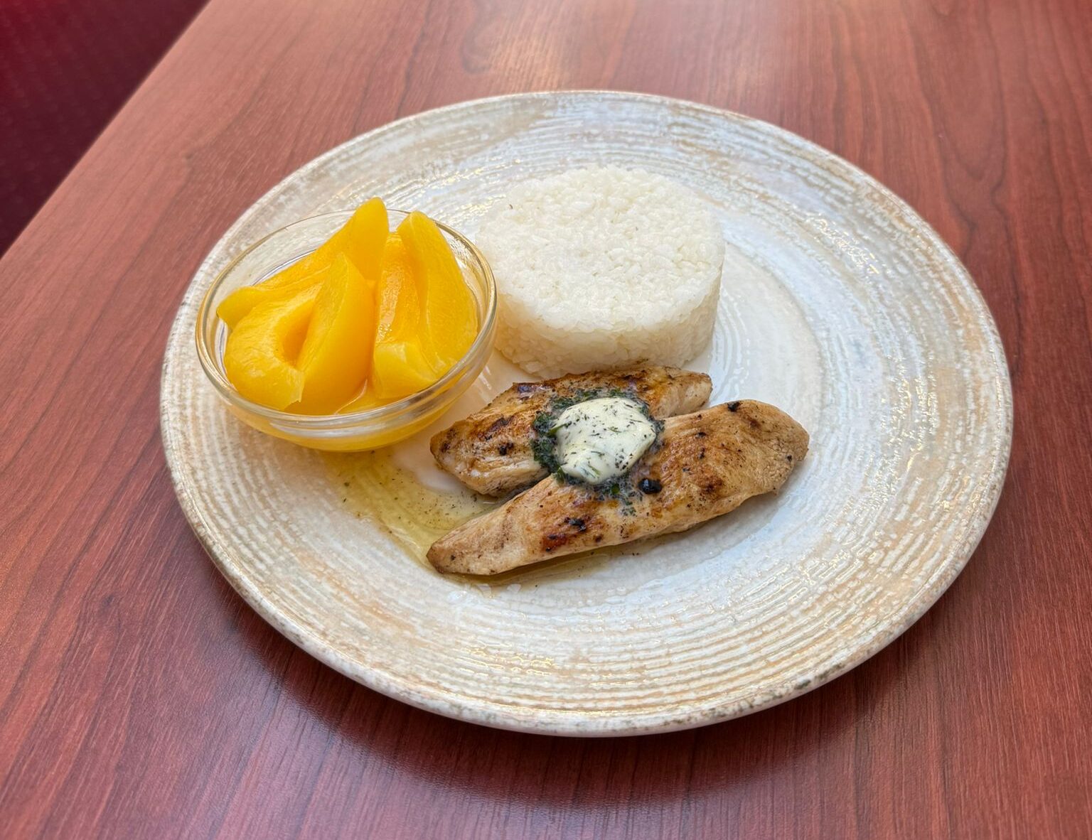 Grilované kuracie prsia na masle s ryžou, broskyňový kompót (7)
